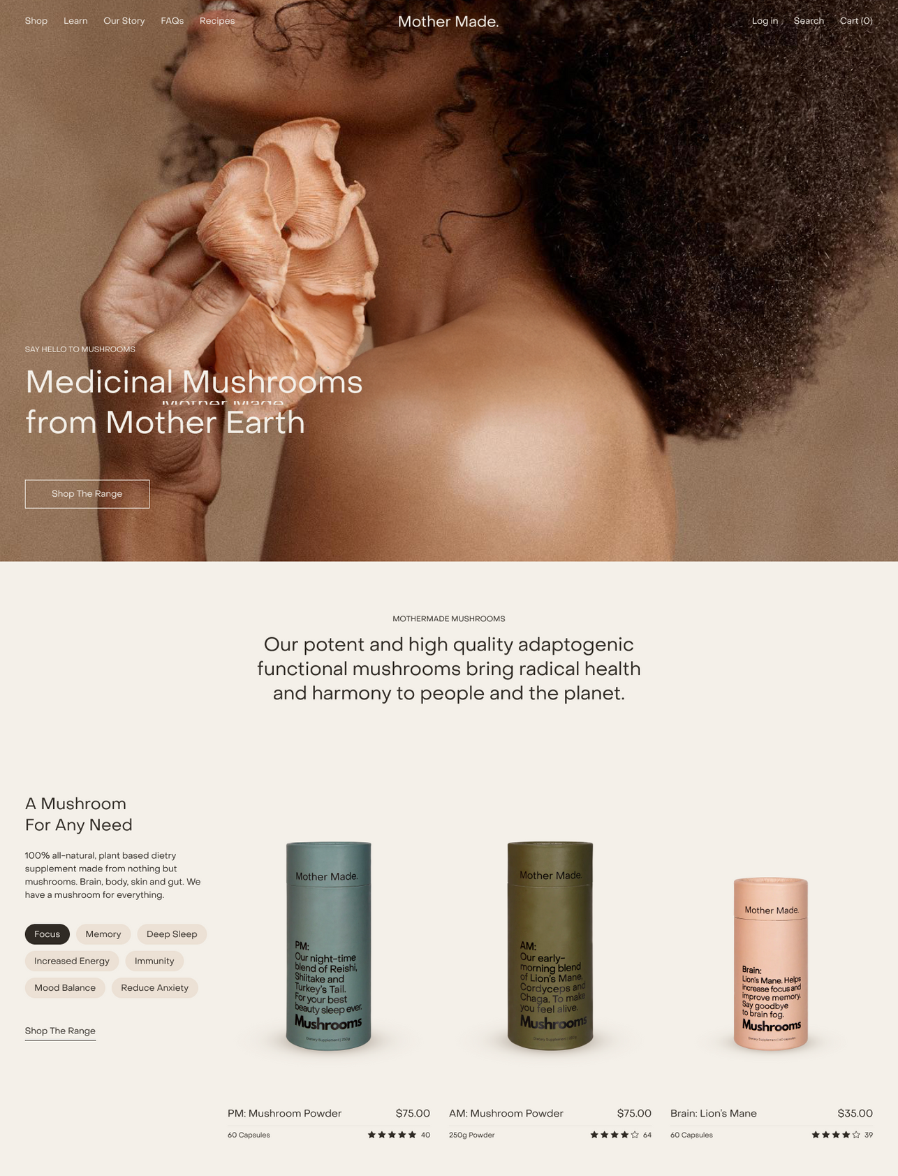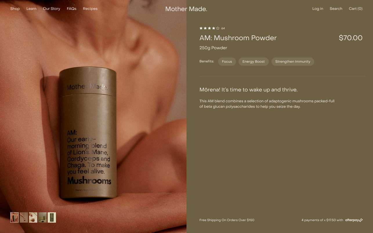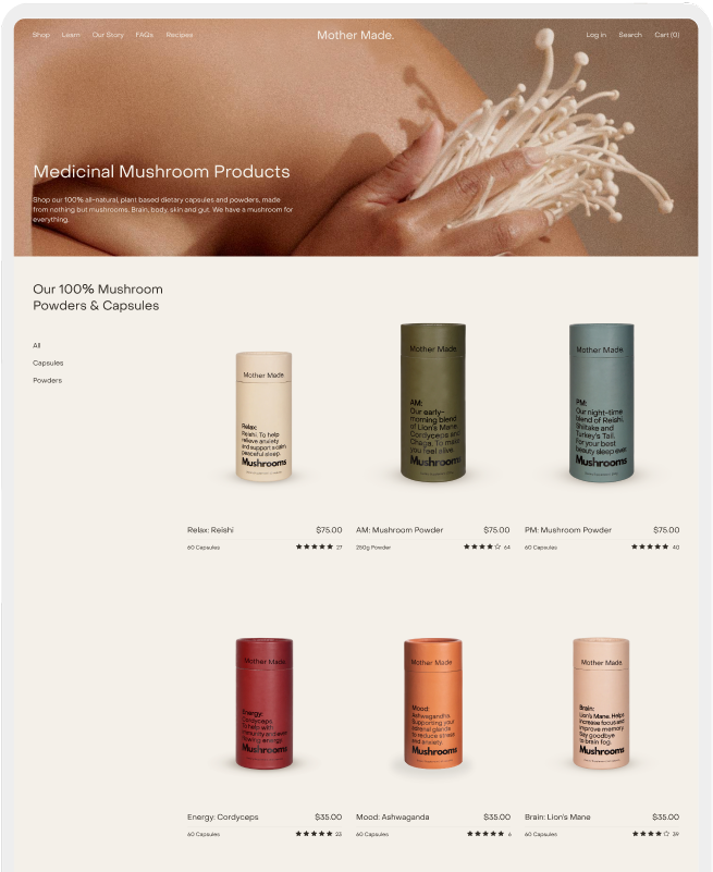 Playceholdr helped Mother Made bring their mushroom-powered ethos to life online. The new Shopify store blends calm sophistication with an energetic edge that reflects the brand’s bold approach to wellness.